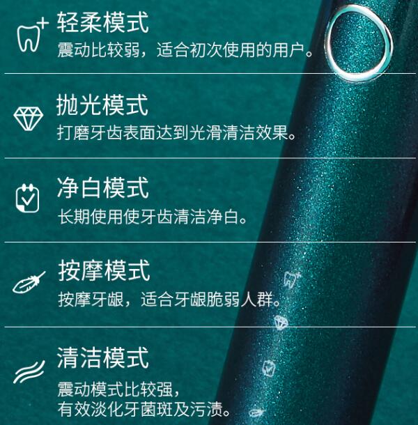 【S300 智能聲波電動牙刷】在性能上也同樣優(yōu)秀,模式記憶功能,電動牙刷停止刷牙運(yùn)行后,下次即可繼續(xù)使用上次的刷牙模式,甩掉再次選擇模式的苦惱。此外,在外觀上,這款成人敏感牙齦電動牙刷也很受都市白領(lǐng)們的歡迎。一鍵式的全功能切換簡約設(shè)計(jì),契合簡約美感;同時顏色的搭配上,拋開了千變一律的黑白色調(diào),采用多種高顏值的色彩點(diǎn)綴,滿足不同了風(fēng)格人群的使用,例如:皓月白的優(yōu)雅、睿智黑的炫酷、深邃藍(lán)的莊重及冷光藍(lán)、冷光綠的舒緩及深遠(yuǎn)……
