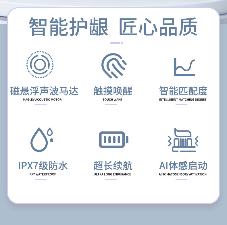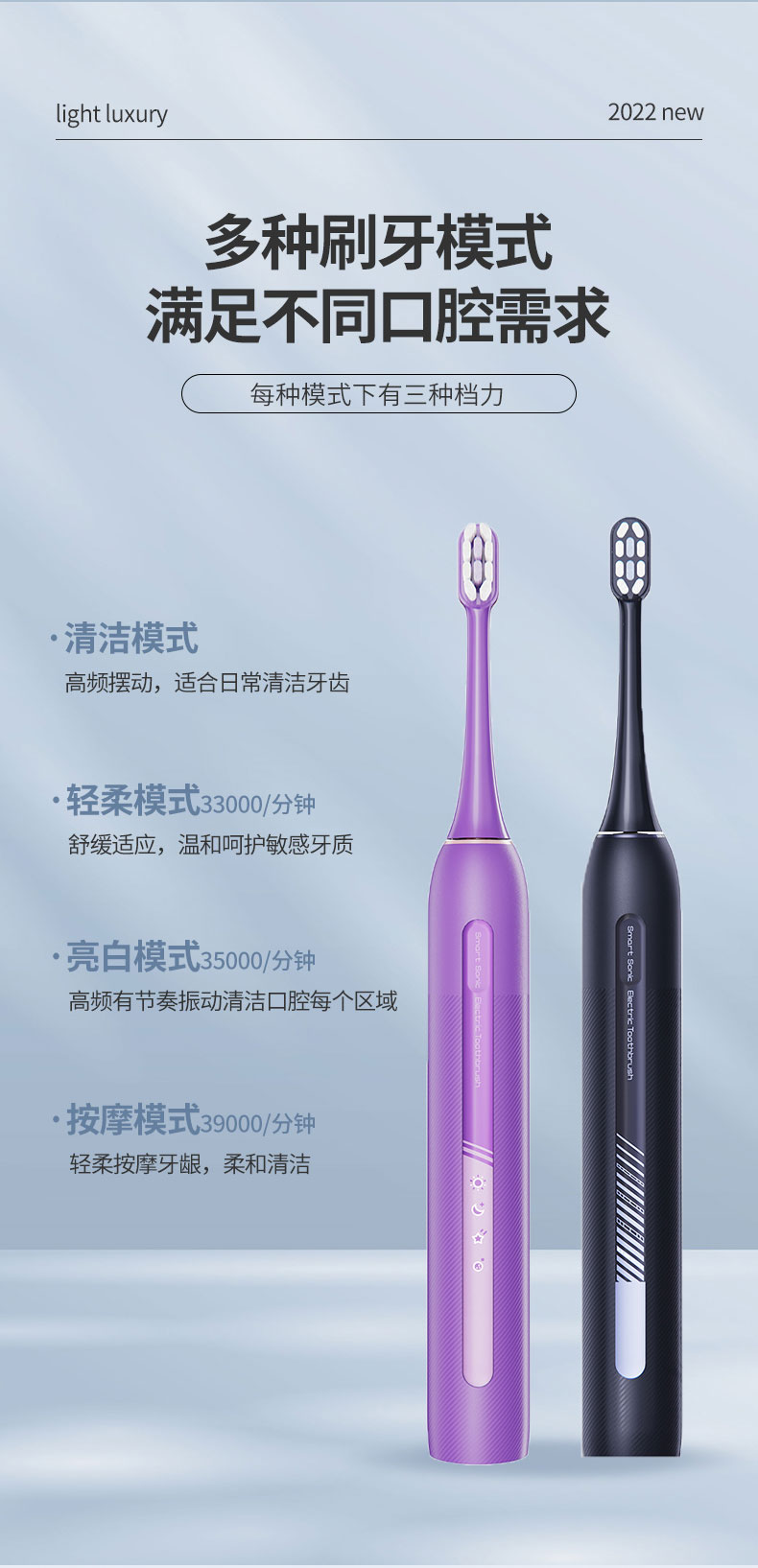 聲波口潔力新一代電動牙刷–刷博士【聲波感應智能電動牙刷】是一款新研發創新的感應式聲波電動牙刷,可實現“入口即開,離口即停”,告別按鍵的感應黑科技。這款【聲波感應電動牙刷】多種刷牙模式且每種模式下均有3檔力度調節,可滿足不同口腔需求;USB直充,方便易攜帶,出差旅行收納省心;iPX7級防水全身可水下沖洗,沐浴使用也不怕,隨意浸泡,也滴水不入,給你十足安全感!